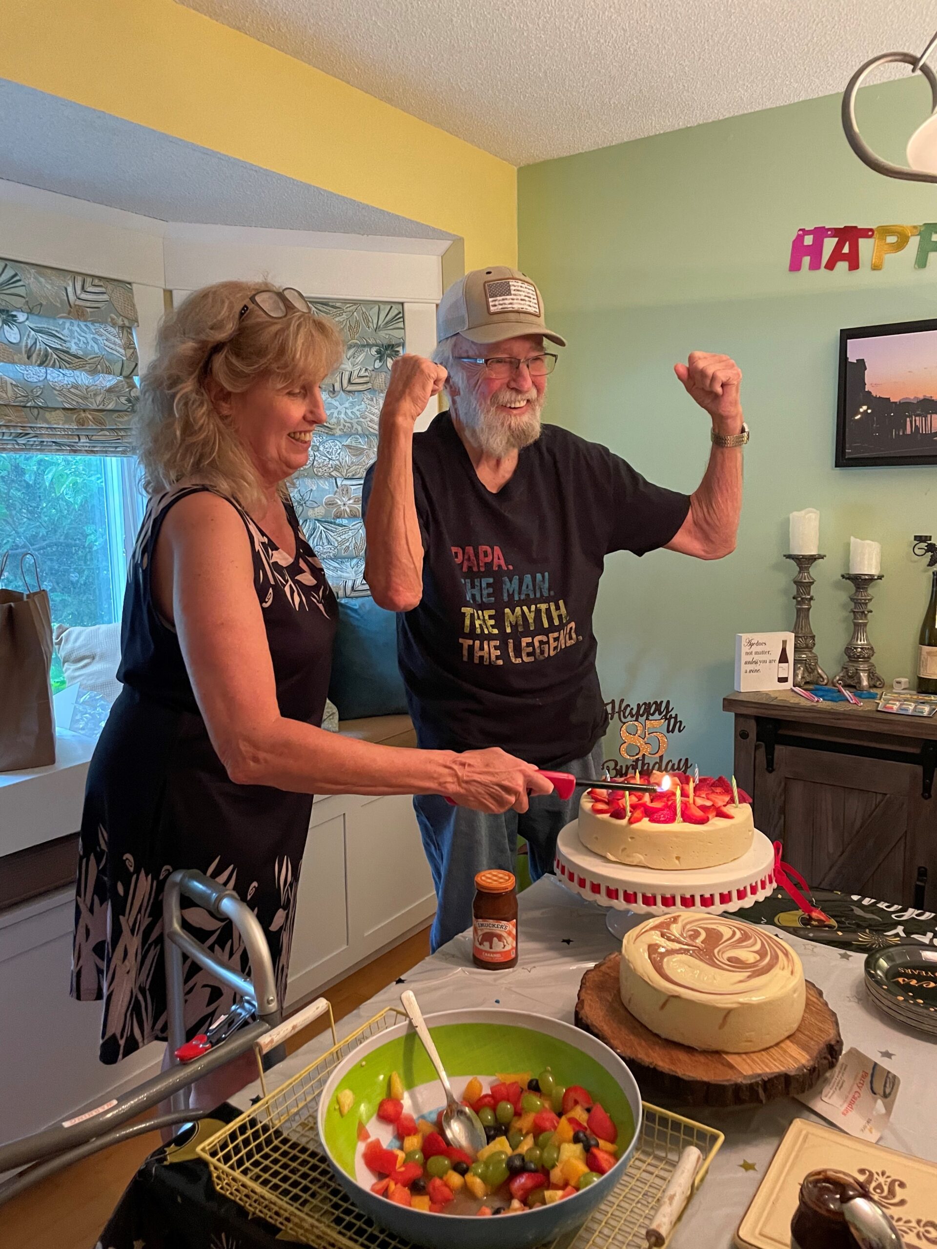 Laura lights the candles on Gary’s birthday cake as Gary cheers during his 85th birthday celebration.