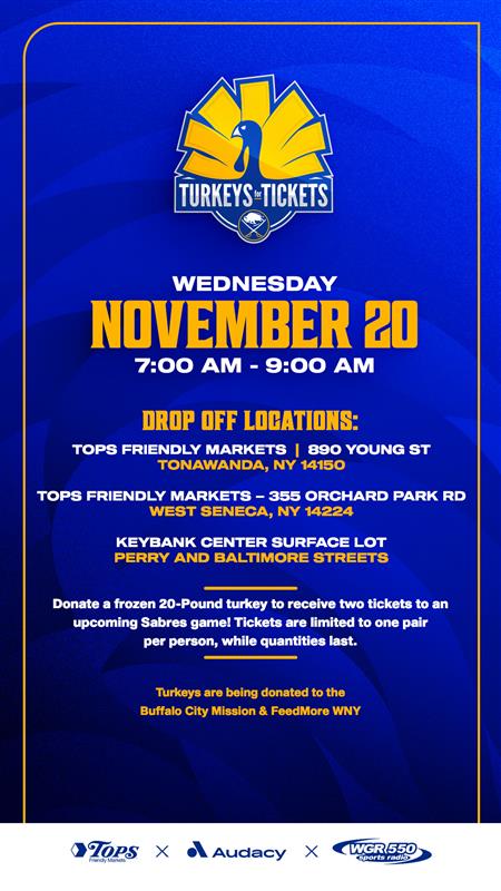 On Wednesday, November 20, from 7 to 9 a.m., fans can donate a frozen 20-pound turkey at one of three convenient drop-off locations. In return, each donor will receive a voucher good for two tickets to an upcoming Sabres home game. It’s a unique opportunity to make a direct impact in our community while celebrating the spirit of giving.
