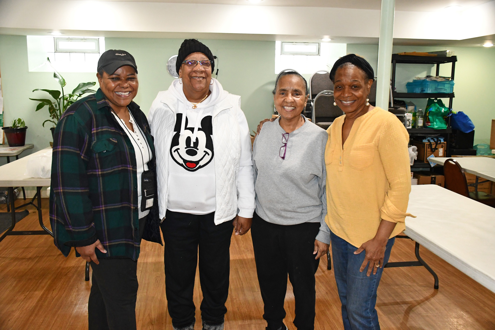 Iola, far left, and Cynthia, far right, pose with dedicated pantry volunteers, Mother Harold, center left, and Sister Pam, center right. “They have been so great for this pantry, and they have taken on the same spirit [as my parents],” Cynthia said of her volunteers.
