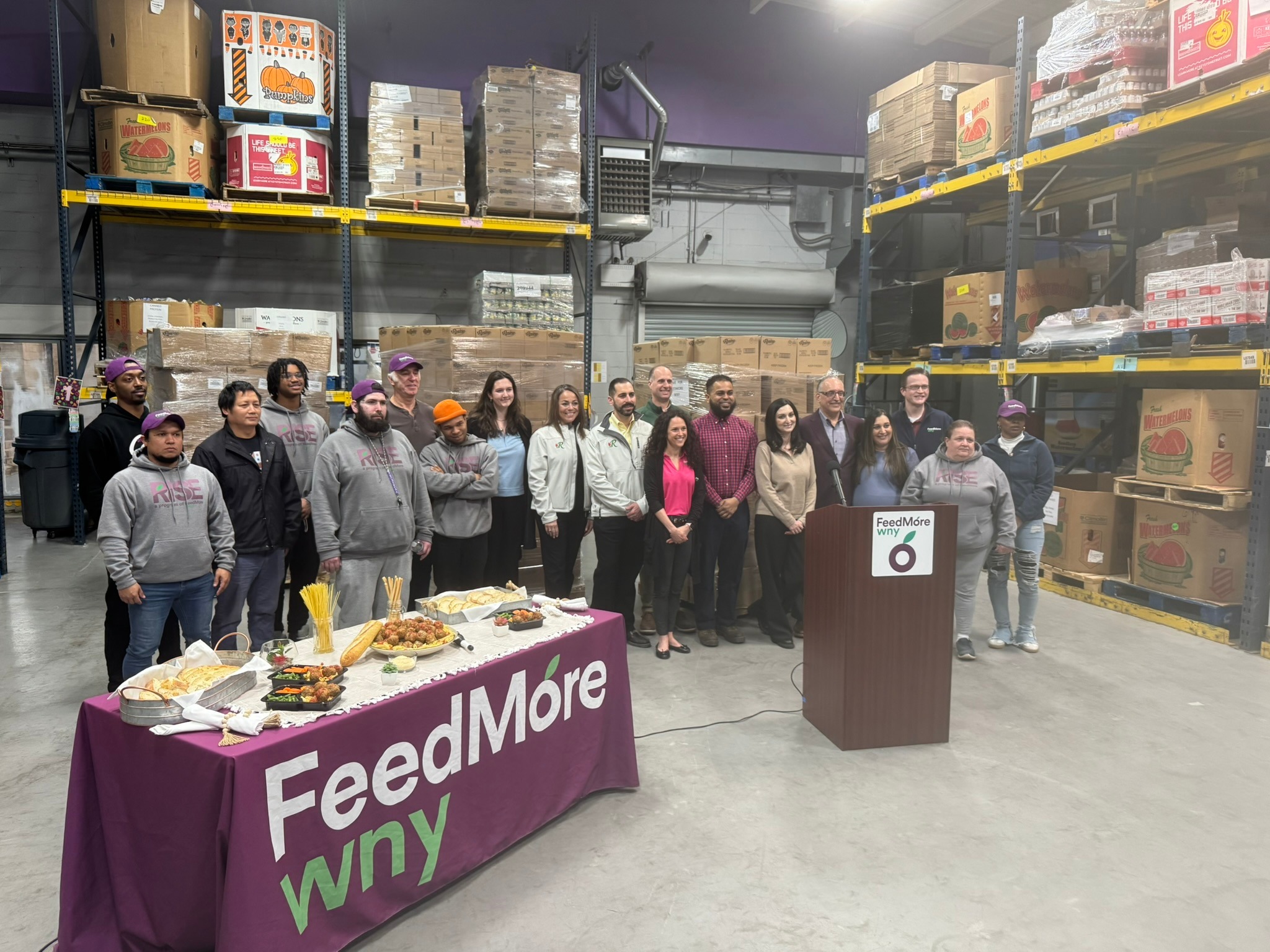 Matthew Padilla graduated from our RISE program in September and now works as a warehouse supervisor at Rosina’s meatball production plant. He attended the National Meatball Day donation and Celebration in FeedMore WNY’s warehouse in a full-circle moment for both organizations.