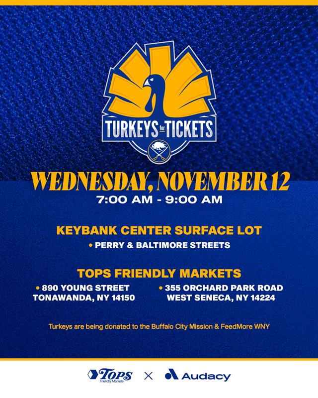 The Buffalo Sabres, Tops Friendly Markets and Audacy are teaming up once again for the annual Turkeys for Tickets drive to support families in need this Thanksgiving. The event will take place on Wednesday, November 12, 2025, from 7 to 9 a.m. Individuals are invited to donate a frozen 20-pound turkey, or the equivalent, to help provide holiday meals for our neighbors in need. Each person who donates a frozen 20-pound turkey will receive one voucher good for two tickets to a select Buffalo Sabres home game, while supplies last.