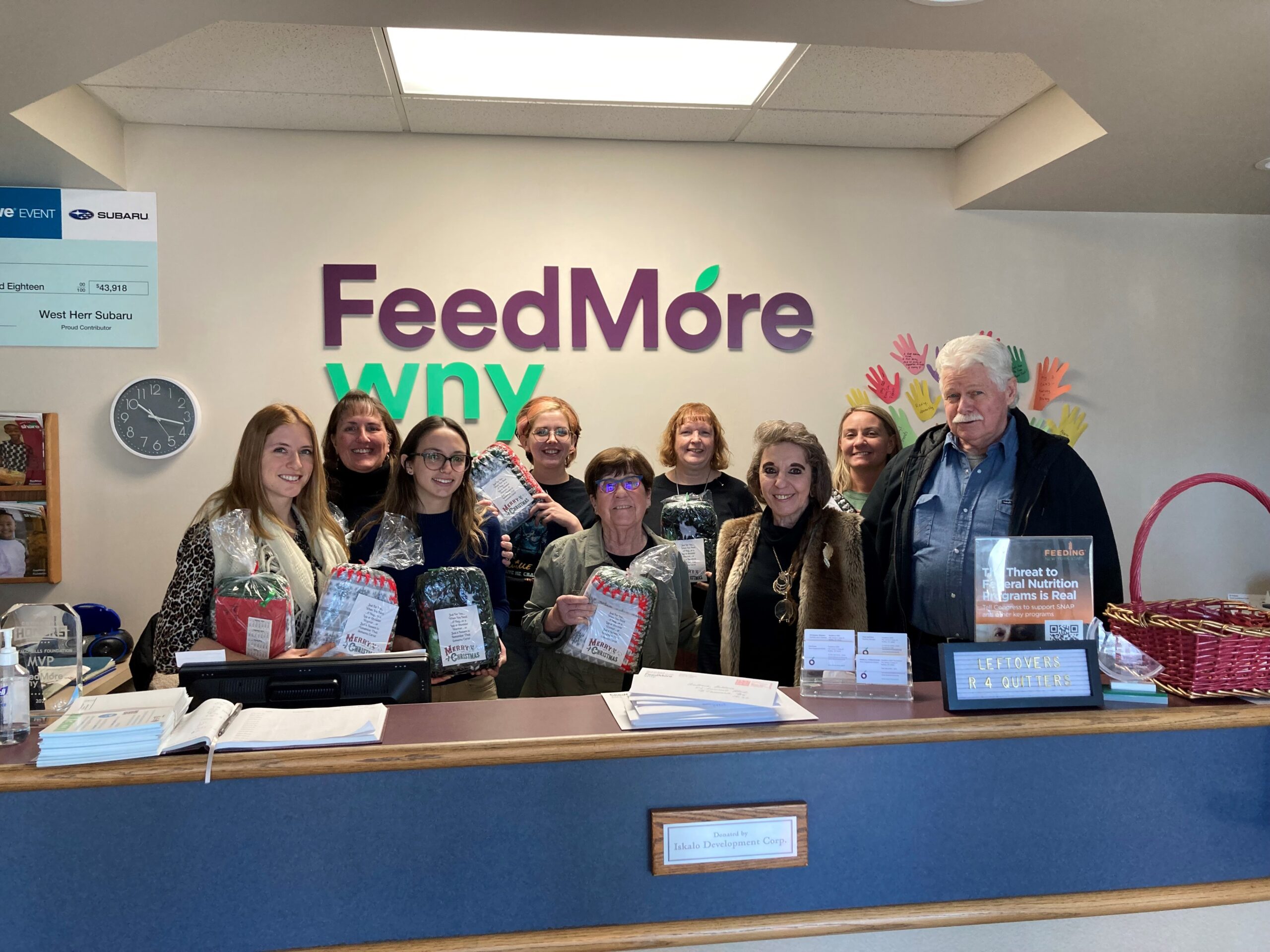 In the bottom photo, the Social Work team at FeedMore WNY extend holiday greetings to Kathy Halliday after she delivered donations to the organization’s headquarters.