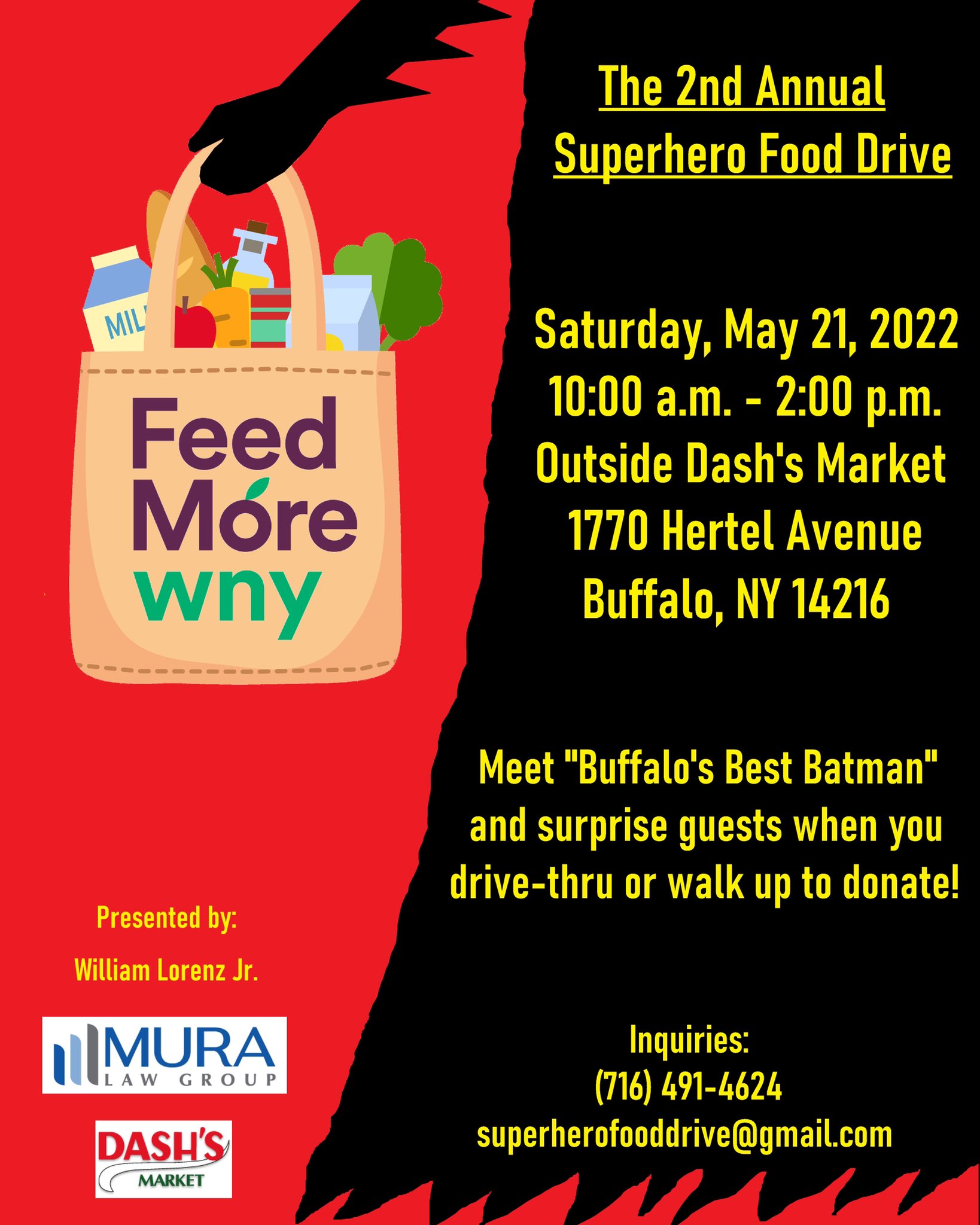 Buffalo’s Best Batman and surprise guests from the superhero community are coming together to fight hunger in Western New York! The 2nd annual Superhero Food Drive will be held at Dash’s Market on Hertel Avenue – both drive-thru and walk-up donations are welcome!