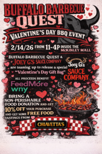 Buffalo Barbecue Quest is proud to announce a special Valentine’s Day charity event in partnership with Joey G’s Sauce Company, FeedMore WNY, and Chiavetta’s BBQ. The event will take place on Saturday, February 14, 2026, from 11:00 a.m. to 4:00 p.m. at Buffalo Barbecue Quest in the McKinley Mall, bringing together great food, great flavors, and a great cause.