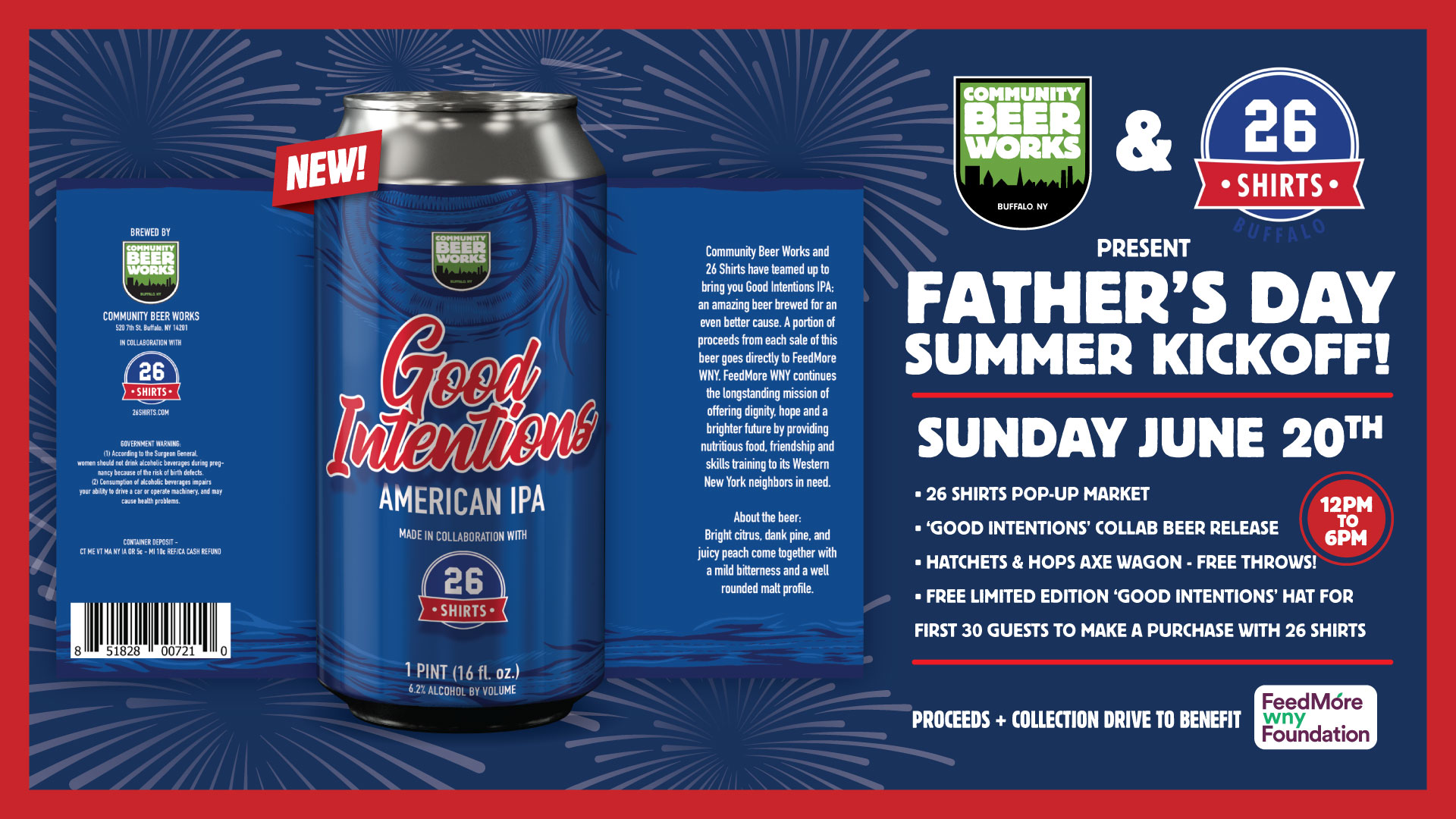 Get ready to join Community Beer Works (CBW), 26 Shirts, Hatchets and Hops and FeedMore WNY this Father’s Day for an afternoon filled with fun, sun and “Good Intentions”! Community Beer Works and 26 Shirts have teamed up create Good Intentions IPA! This beer is brewed for an even better cause: a portion of proceeds from each sale of this beer goes directly to FeedMore WNY!