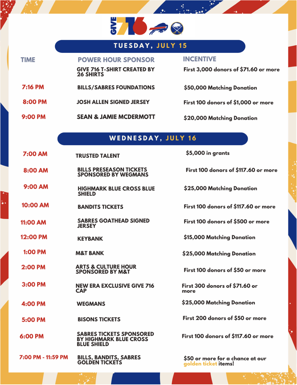 Give 716 – our community’s epic online giving event powered by the Buffalo Bills and Buffalo Sabres foundations – is back on July 15 and 16 with incredible prizes! Donate to FeedMore WNY early during the designated Incentive Hours for your chance to win exclusive memorabilia from the Buffalo Bills and Buffalo Sabres – and much more!
