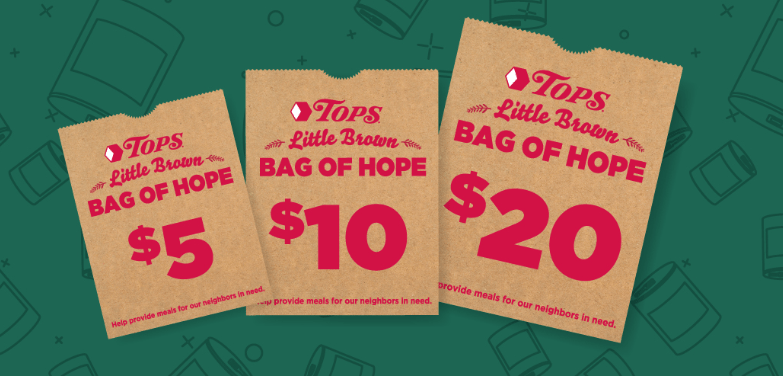Throughout the holidays, you can participate by purchasing a virtual “Little Brown Bag of Hope” at any Tops Friendly Markets in our service area. With a $5, $10, or $20 donation at the register, your contribution will directly provide food to local families.